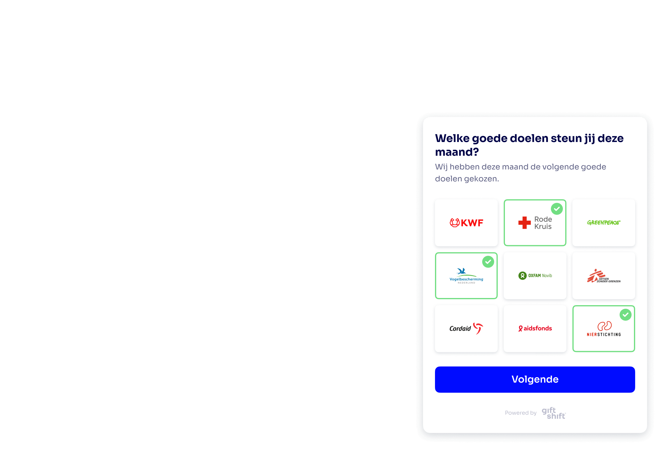 Super fijn dat we bedrijven nu niet meer hoeven te laten kiezen tussen het goede doel dat ze willen steunen. Zij kunnen dat aan hun klanten of medewerkers zelf overlaten. GiftShift brengt goede doelen en bedrijven samen!