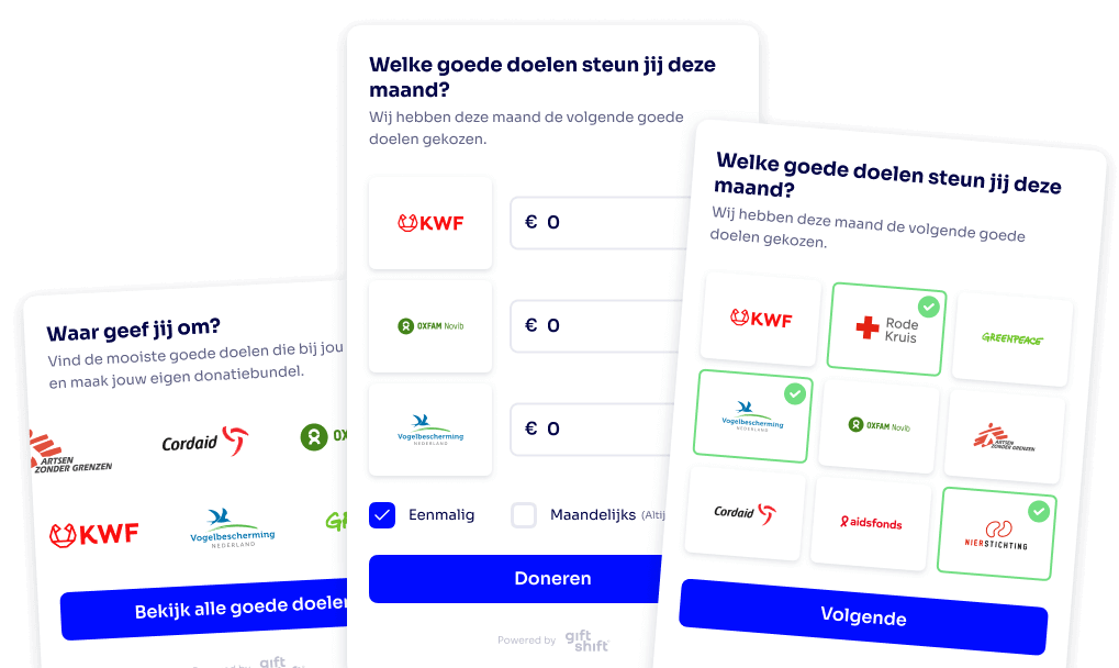GiftShift is hét impactplatform dat goede doelen, donateurs én organisaties samenbrengt in een gedeelde missie om impact te maken voor een betere wereld. Door samen te werken met GiftShift steun je de goede doelen, waardoor zij kunnen doen waar zij het beste in zijn en zo hard nodig is: de wereld een beter plek maken, nu en in de toekomst.